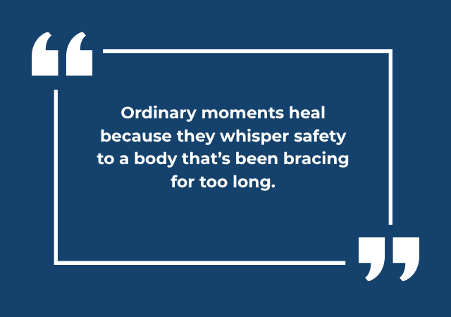 So when you begin to be grateful for the ordinary, you are not engaging in toxic positivity; you are introducing micro-recalibrations that broaden your mental landscape. You are giving your brain permission to register what so often goes unnoticed: the sensory anchors that remind your body that, in this moment, you’re safe enough to soften your grip on survival mode.