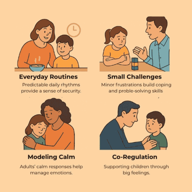 Across these recurring moments—morning rhythms, goodbyes, shared meals, and bedtime rituals—children repeatedly receive the message that the world has a predictable shape and that they are not left to navigate it alone. This sense of reliability is a cornerstone of emotional resilience in kids.