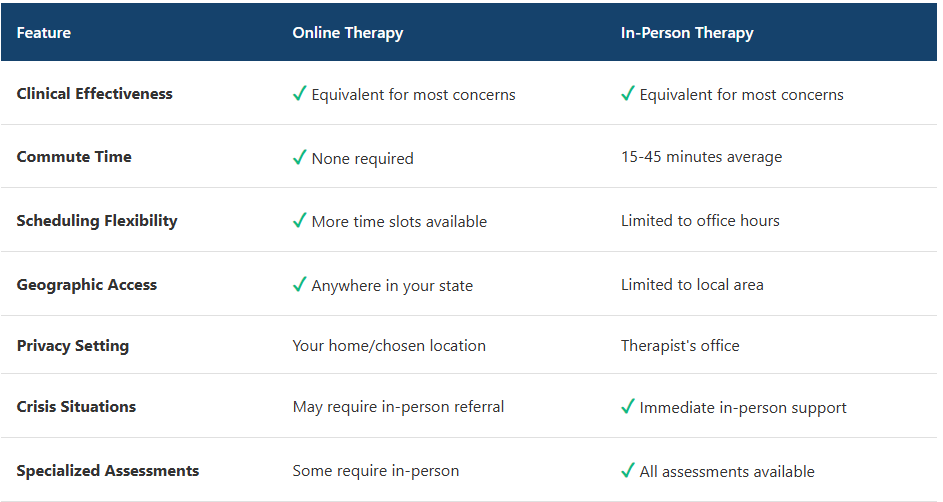 For many mental health concerns, online sessions deliver the same interaction, focus, and clinical outcomes as traditional therapy.