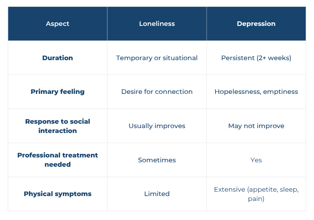 Understanding whether you’re experiencing loneliness or depression matters because loneliness is positively correlated with the negative feelings and self-judgment that characterize depression.