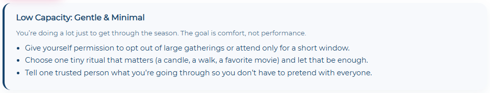 If you’re navigating your first holiday after loss: Establish a memorial act that transforms grief into meaning while processing grief in a healthy way. Visit a place they loved and do something they would have enjoyed. One daughter created a “Dad would have loved this” photo album throughout December. “It kept him present without making everything about missing him.”