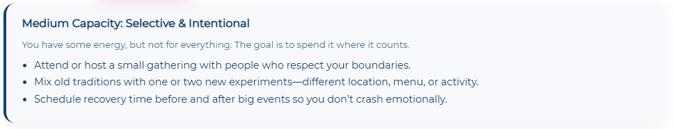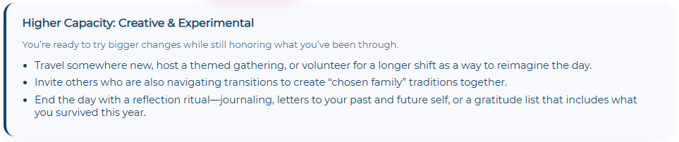 If the expectation of cooking and hosting feels impossible: Rewrite the rules while navigating life transitions. Order takeout from three different restaurants and make it a tasting menu. Prepare one meaningful dish and make everything else store-bought. Host a potluck where everyone brings one item. These choices honor your capacity while still creating meaningful celebration.